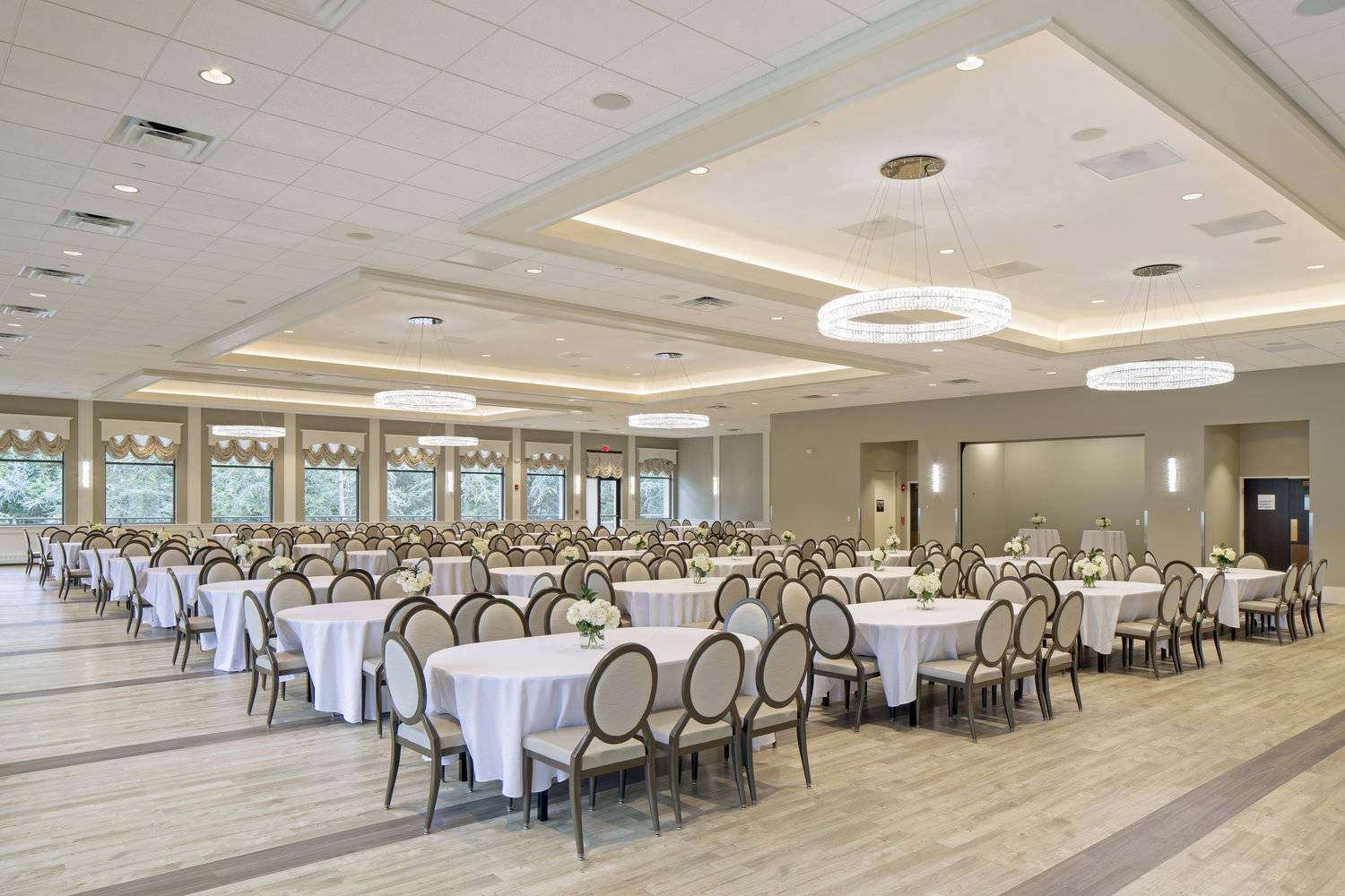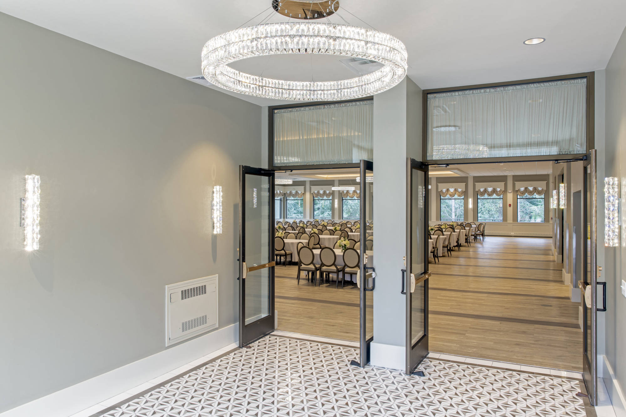 This 6500 square foot ballroom is filled with high ceilings, warm lighting and neutral colors.